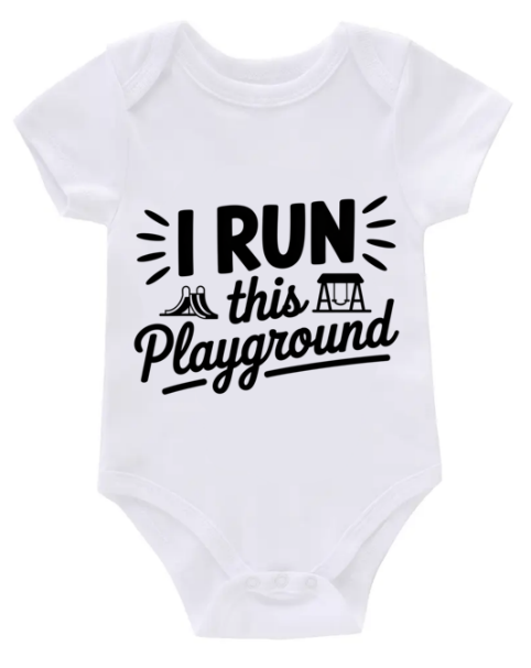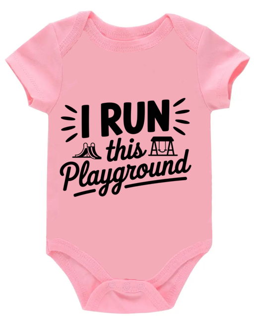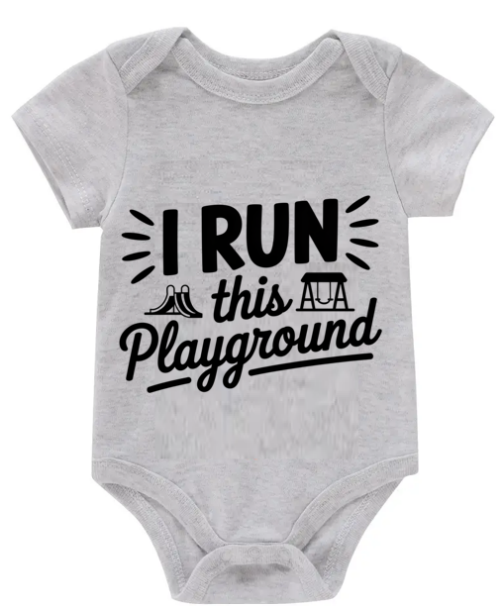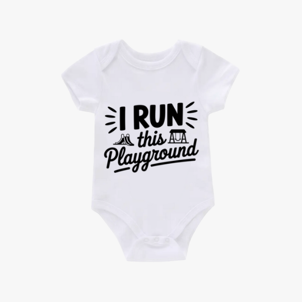 I Run This Playground Babygrow. Comes in three colours – Grey, Pink and White.
