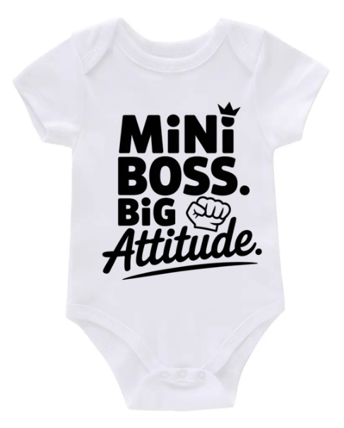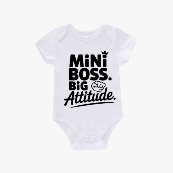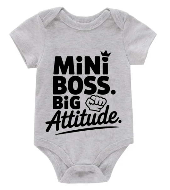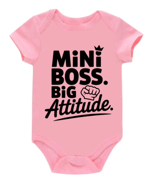 Mini Boss Big Attitude Babygrow. Comes in three colours – Grey, Pink and White.