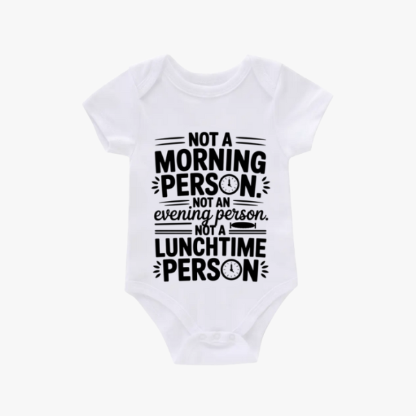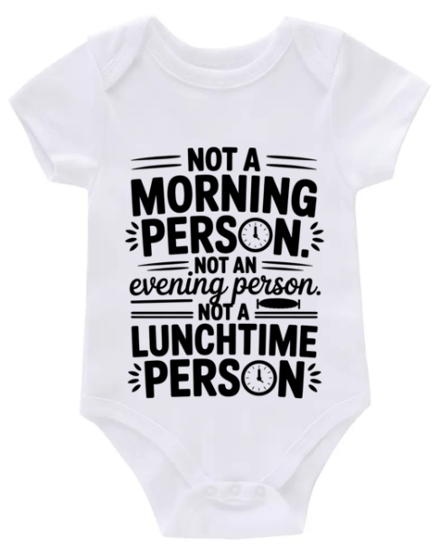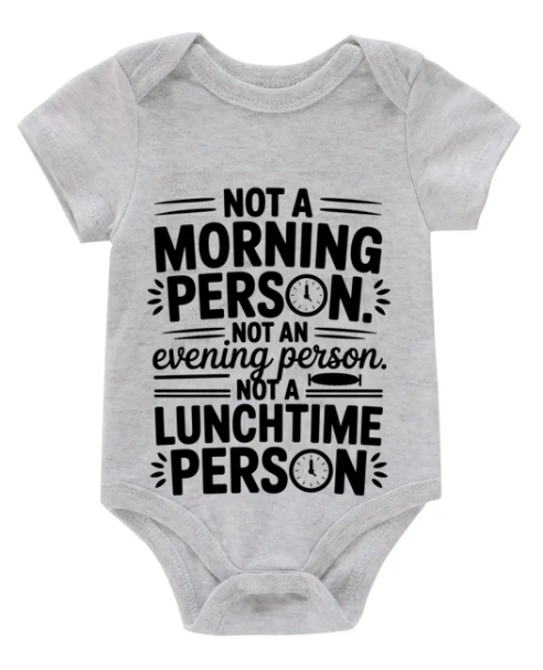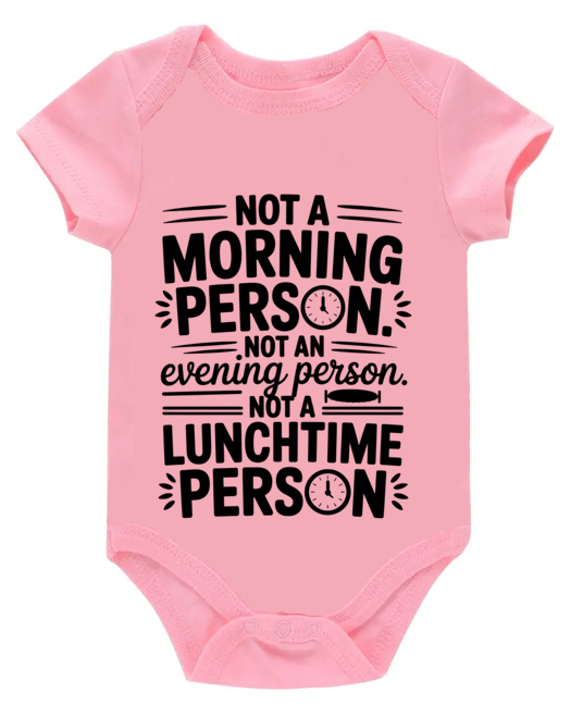 Not A Morning Person Babygrow. Comes in three colours – Grey, Pink and White.